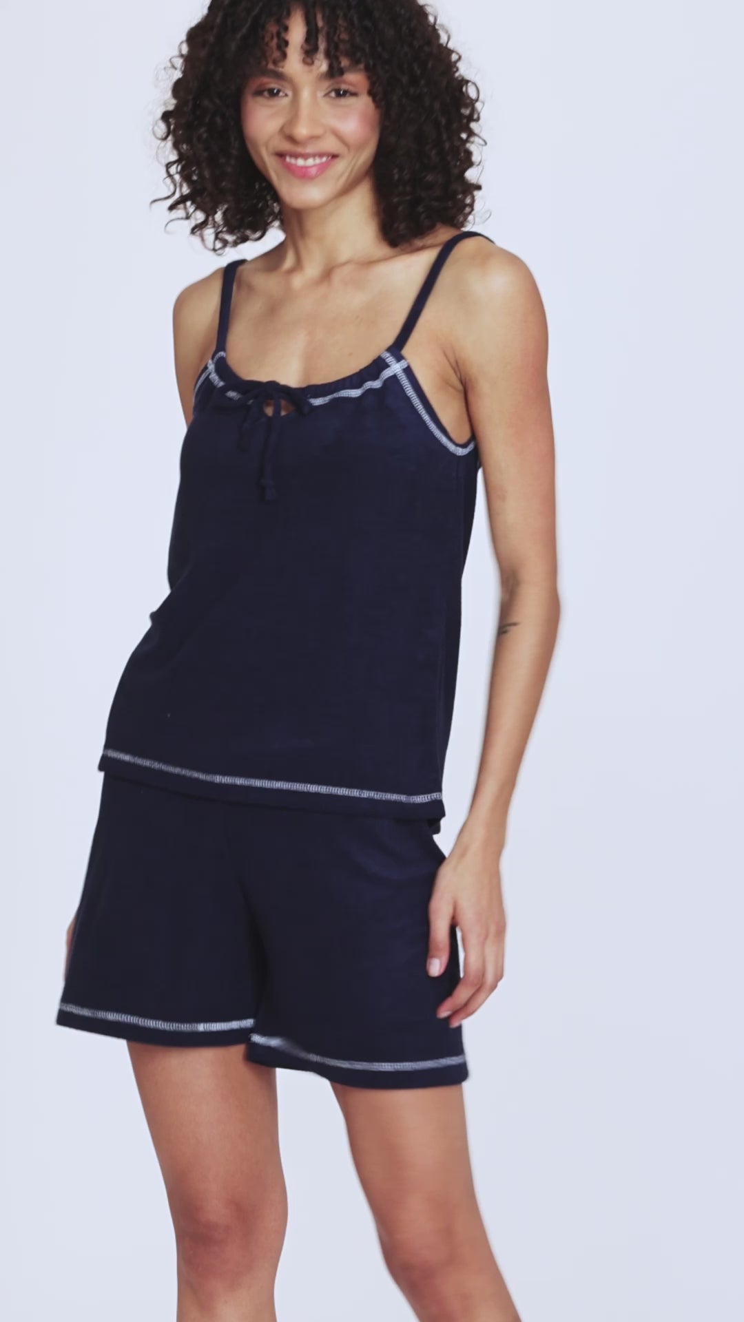 Women's terry cotton 2-piece short and tank top pajama set. Elastic waistband.